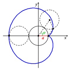這或許是意味著心臟線的圖。一個圓沿著另一個半徑相同的圓滾動時,圓上一點的軌跡就是所謂心臟線。