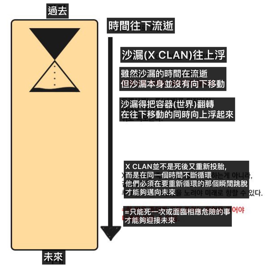 為了翻轉沙漏(X CLAN)的時間(為了讓時間倒流)必須反轉整個容器(世界)—是這個沙漏的特殊設計